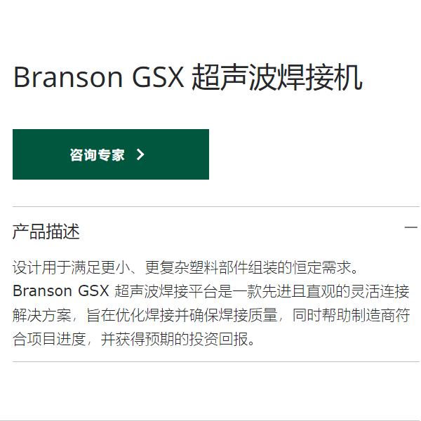 设计用于满足更小、更复杂塑料部件组装的恒定需求。Branson GSX 超声波焊接平台是一款先进且直观的灵活连接解决方案,旨在优化焊接并确保焊接质量,