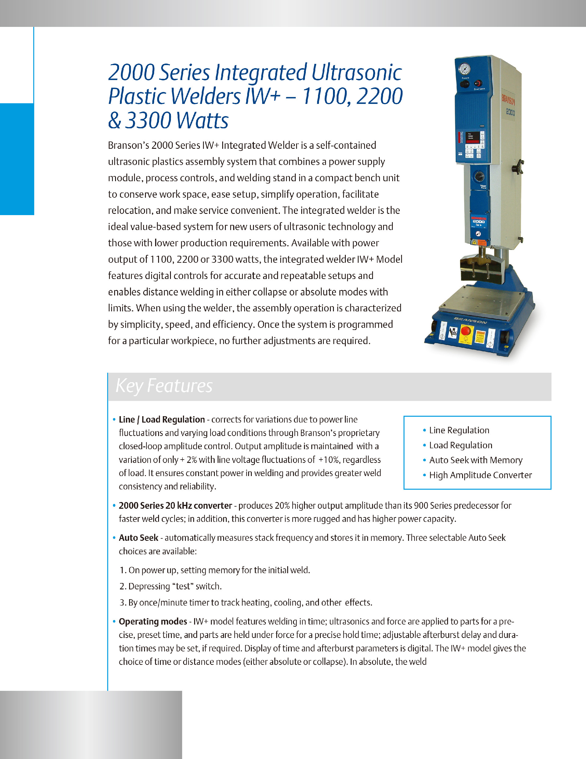这款独立的塑料焊接系统将超声波发生器、过程控制装置、座架和执行器集成在一个紧凑装置中,节省了空间。该系统经过专门设计,易于设置、操作简单,且易于在设施中更换位置。非常适用于实验室环境,或用于满足较低容量的生产要求。频率 20 kHz,功率可选择 1.1、2.2 和 3.3 kW。