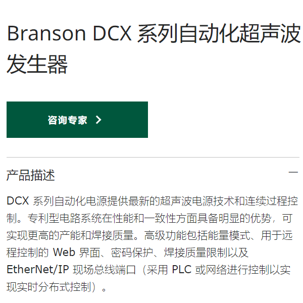 DCX 系列自动化电源提供最新的超声波电源技术和连续过程控制。专利型电路系统在性能和一致性方面具备明显的优势,可实现更高的产能和焊接质量。高级功能包括能量模式、用于远程控制的 Web 界面、密码保护、焊接质量限制以及EtherNet/IP 现场总线端口(采用 PLC 或网络进行控制以实现实时分布式控制)。