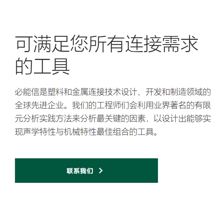必能信是塑料和金属连接技术设计、开发和制造领域的全球先进企业。我们的工程师们会利用业界著名的有限元分析实践方法来分析最关键的因素,以设计出能够实现声学特性与机械特性最佳组合的工具。