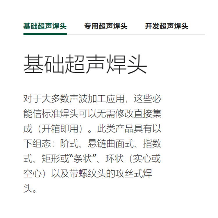 对于大多数声波加工应用,这些必能信标准焊头可以无需修改直接集成(开箱即用)。此类产品具有以下组态:阶式、悬链曲面式、指数式、矩形或“条状”、环状(实心或空心)以及带螺纹头的攻丝式焊头。