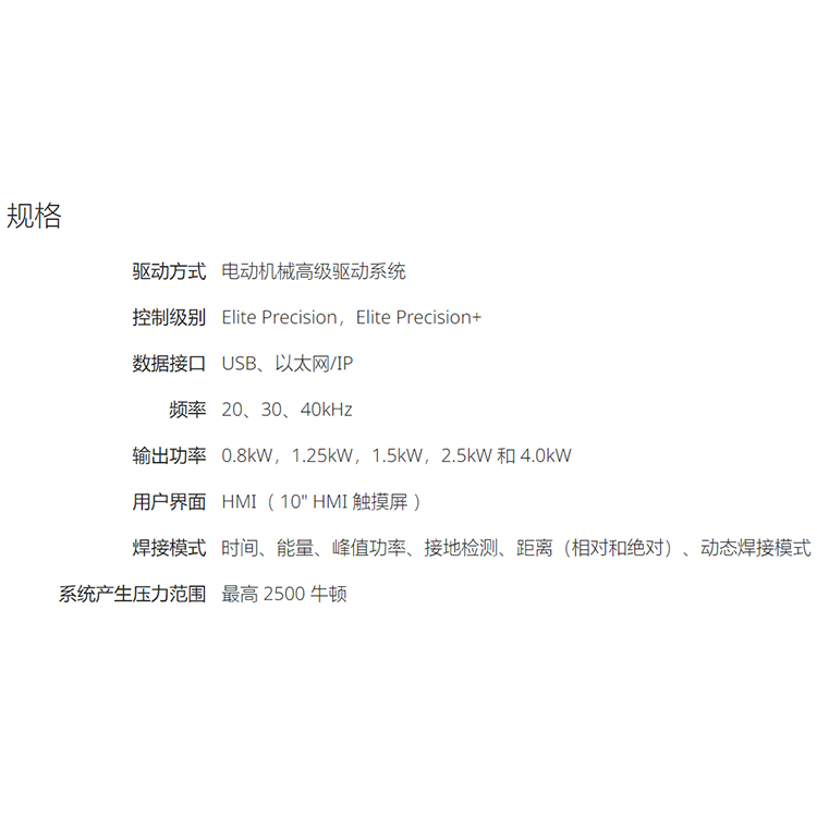 焊接模式时间、能量、峰值功率、接地检测、距离(相对和绝对)、动态焊接模式