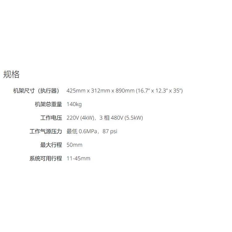 机架尺寸(执行器)425mm x 312mm x 890mm (16.7” x 12.3” x 35”)