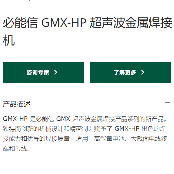GMX-HP 是必能信 GMX 超声波金属焊接产品系列的新产品。独特而创新的机械设计和精密制造赋予了 GMX-HP 出色的焊接能力和优异的焊接质量,适用于高能量电池、大截面电线终端和母线。