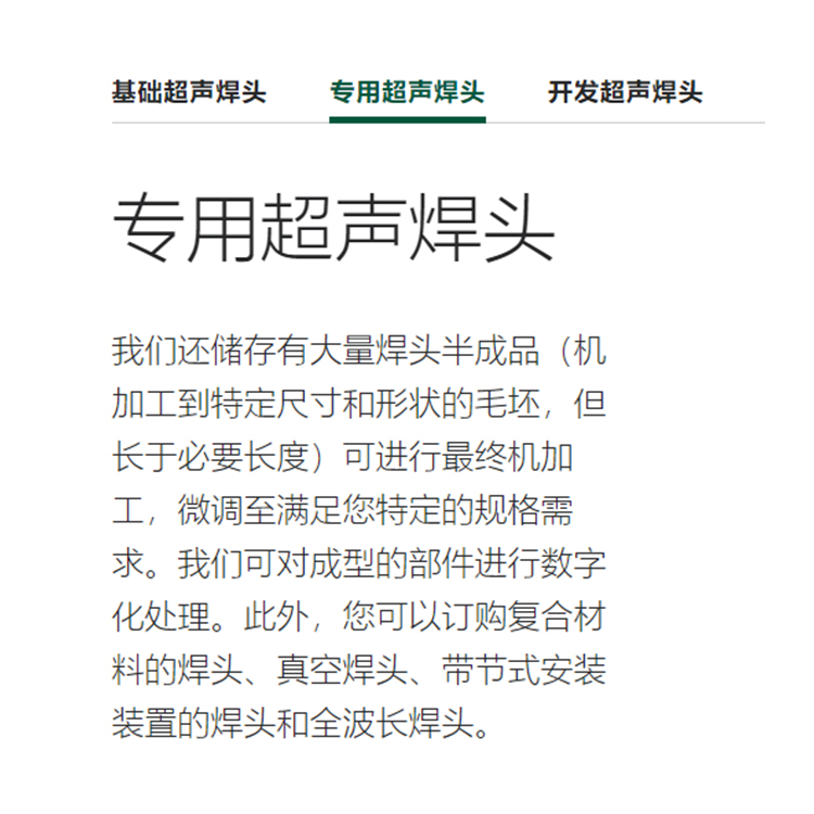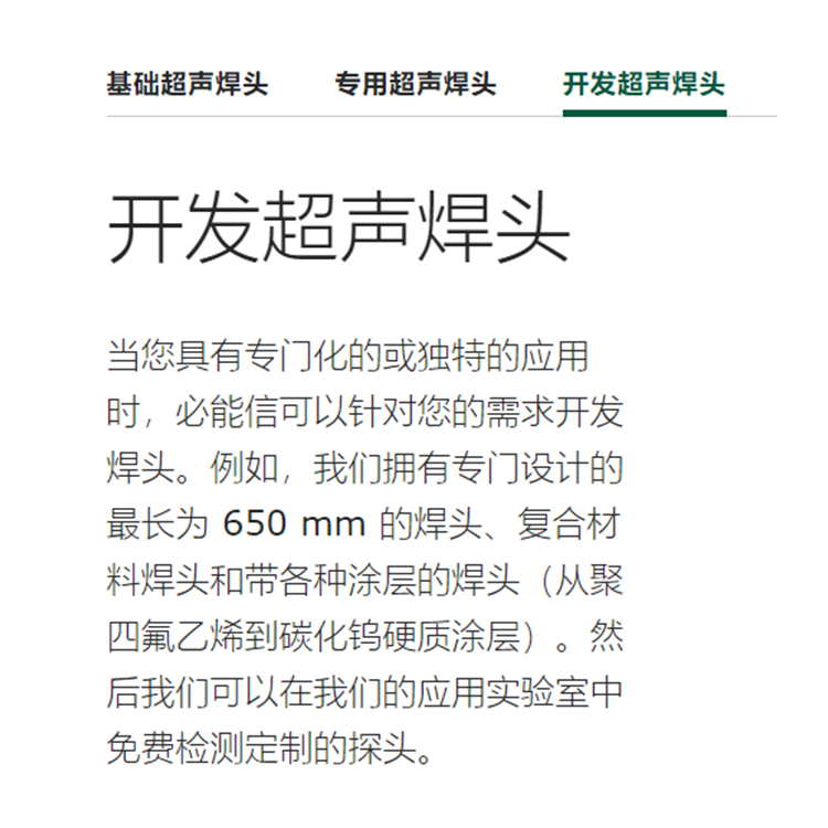 当您具有专门化的或独特的应用时,必能信可以针对您的需求开发焊头。例如,我们拥有专门设计的最长为 650 mm 的焊头、复合材料焊头和带各种涂层的焊头(从聚四氟乙烯到碳化钨硬质涂层)。然后我们可以在我们的应用实验室中免费检测定制的探头。